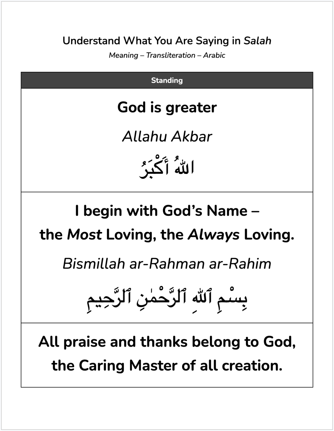 This Salah Meanings Guide contains the translation, transliteration, and Arabic of the essential sayings in salah.